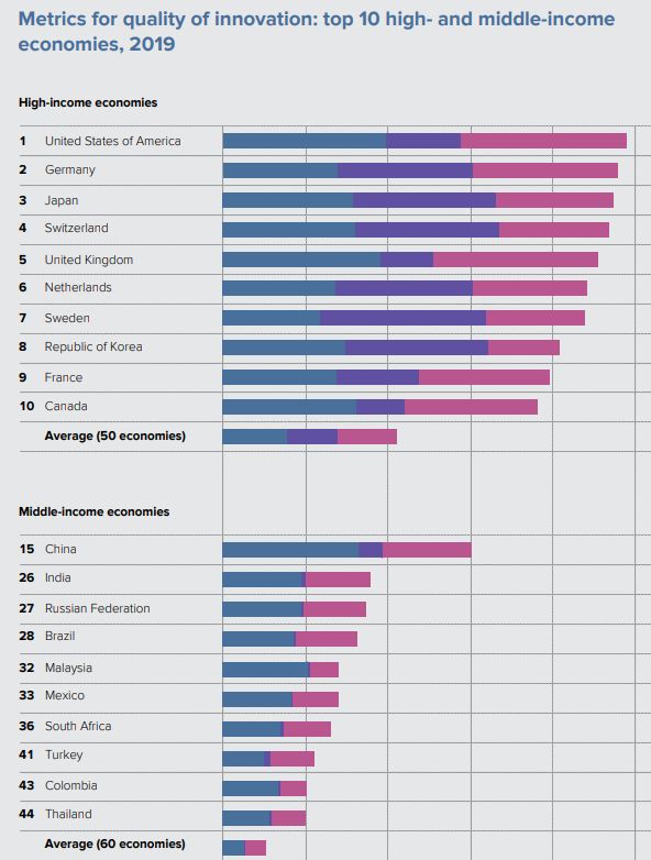 Україна опустилася на чотири позиції в рейтингу найбільш інноваційних країн світу Global Innovation Index 2019 і зайняла 47 місце, повідомляється на сайті Global Innovation Index. У той же час Україна займає друге місце серед європейських країн з доходом нижче середнього рівня.