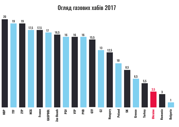 В рейтингу асоціації Україна отримала 3,5 бала і поступилася таким хабам як NBP, TTF, NCG, але випередила Болгарію і Румунію.