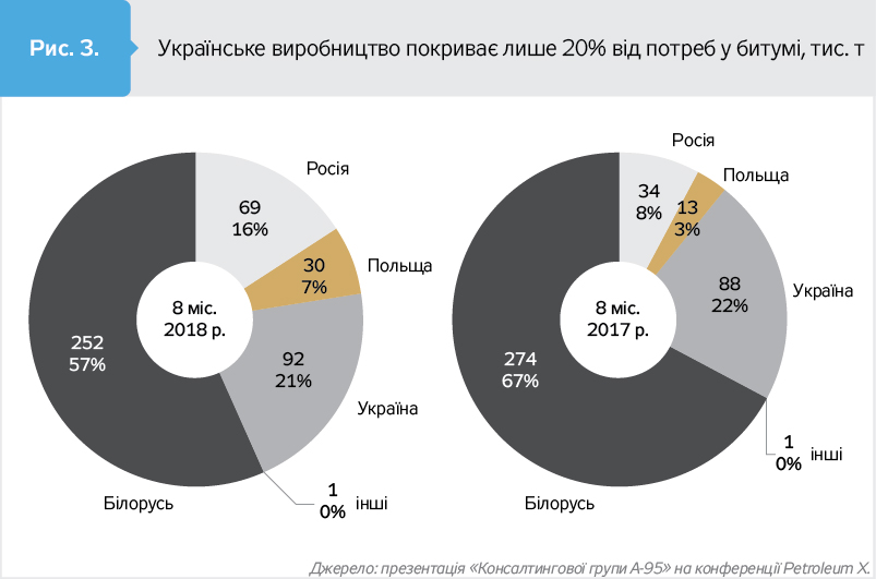 Українські дороги будують переважно з білоруського і російського бітуму. При цьому поставки з Росії в поточному році зросли удвічі, незважаючи на 10-відсоткове мито. Якщо 2010-го українські НПЗ забезпечили 87% поставок бітуму, то у 2017–2018 роках - трохи більш як 20%.