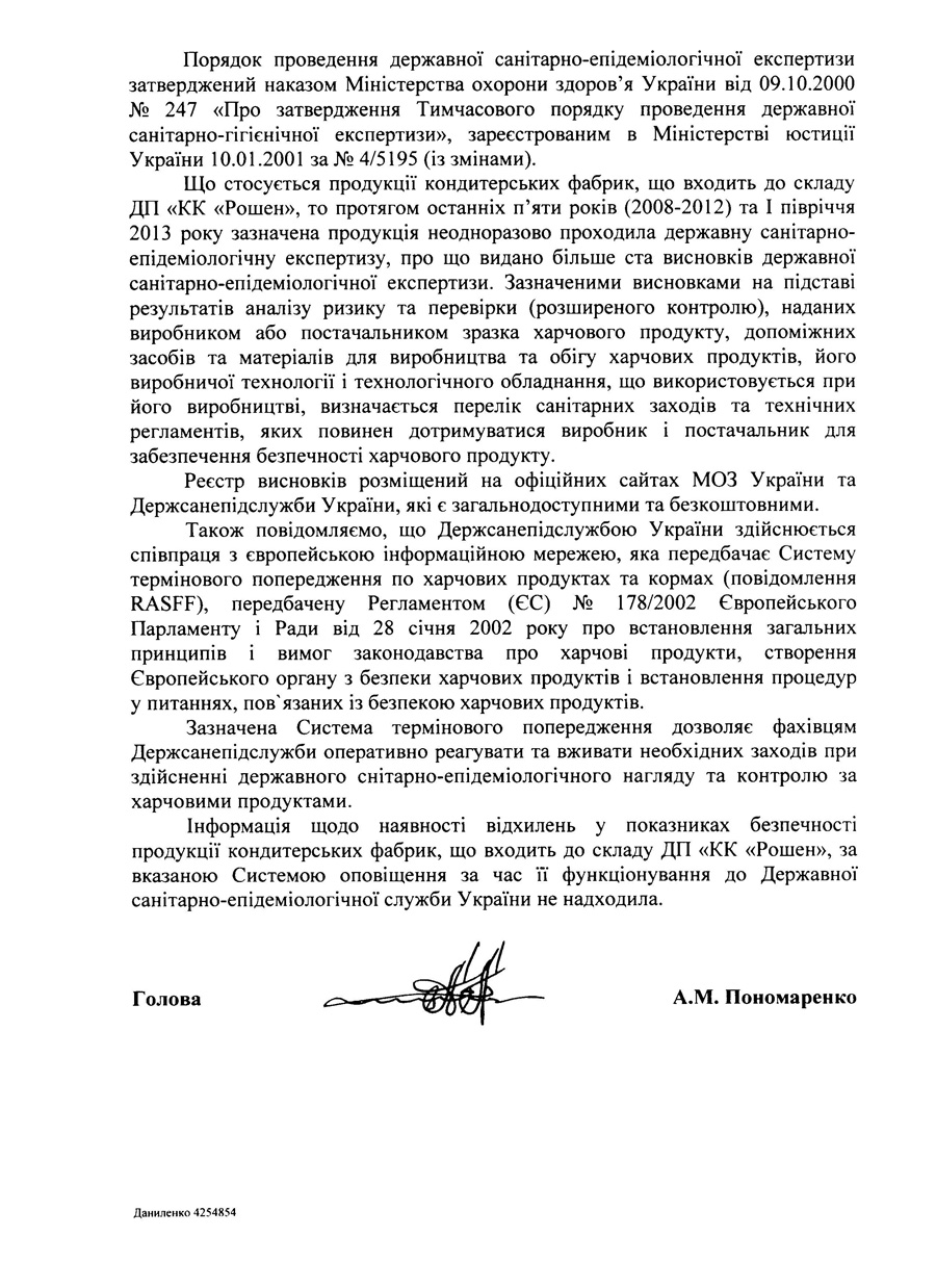 Державна санітарно-епідеміологічна служба України у відповідь на лист асоціації "Укрокондпром" від 06.08.2013 щодо продукції Roshen повідомила: