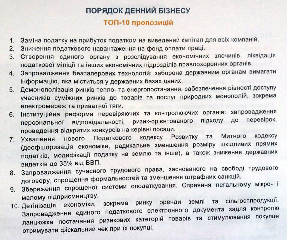 7 лютого Українська рада бізнесу (УРБ) і Союз українських підприємців (СУП), які об'єднали 73 бізнес асоціації і більше 35 тис. підприємств в Національну бізнес-коаліцію, презентували ТОП-10 пріоритетів, які нова влада може взяти в основу своєї майбутньої програми з реформування економіки України. За словами члена Наглядової Ради УРБ Софії Арасланової, ТОП-10 - це консолідований погляд бізнесу на першочергові реформи, а передача бачення бізнесу кандидатам у владу не є передвиборчим проектом, повідомляє "Інтерфакс-Україна".