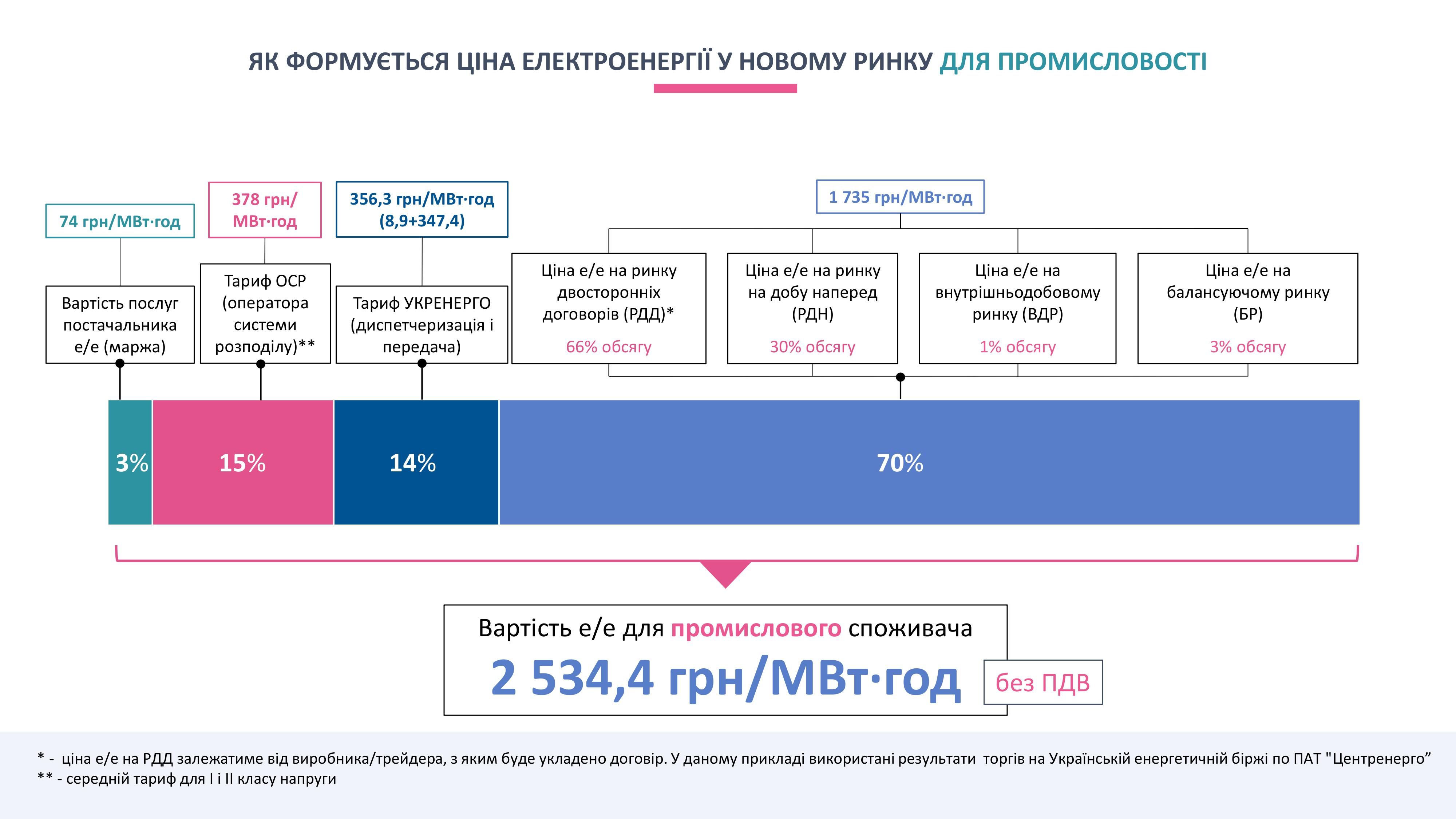 У новому ринку з 1 липня до середньозваженої ціни електроенергії додаються: для великих споживачів з АСКОЕ, що приєднані до мереж Укренерго, – тариф на передачу і диспетчеризацію, які встановлені постановами НКРЕКП № 954 та 955; для споживачів без АСКОЕ (по профілю) І класу напруги, приєднаних до мереж ОСР, додавався тариф на розподіл для І класу напруги; для споживачів без АСКОЕ (по профілю) ІІ класу напруги, приєднаних до мереж ОСР, додавався тариф на розподіл для ІІ класу напруги.
