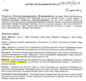 В угоді йдеться за розміщення реклами у травні-серпні виключно у медіа з групи Ріната Ахметова – газеті "Сегодня" та на телеканалі "Україна".