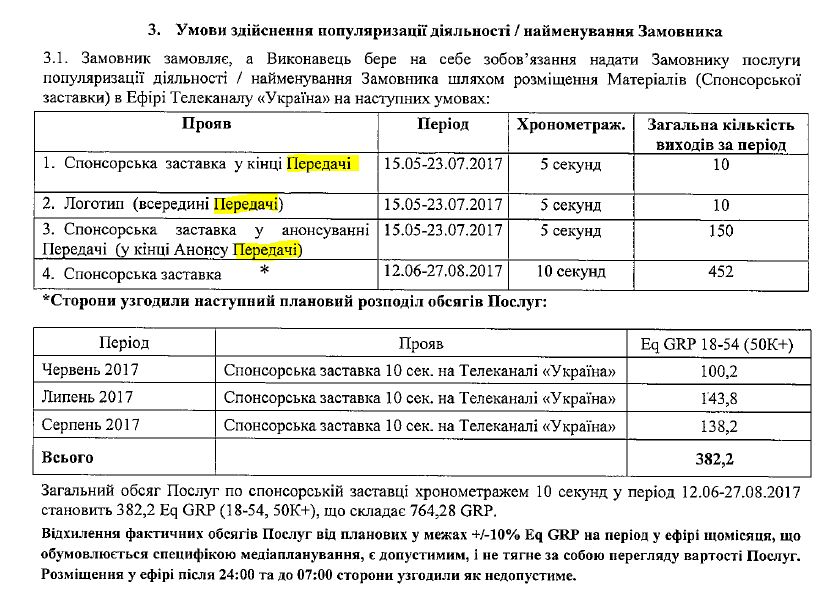 На розміщення у газеті було виділено лише 48 тис грн. Решту 2,08 млн грн. мали витратити саме на телерекламу, яку мали розміщувати як спонсорську в рамках програми "Ранок з Україною" з 15 травня по кінець липня, а решту прокрутити в ефірі "України" в червні-серпні.