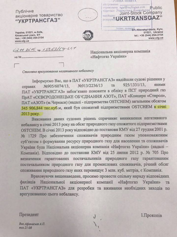 Позиція "Укртрансгазу" з цього приводу висловлювалася зворотними свідоцтвами. З них випливало, що відбір 346 млн куб м газу був здійснений для покриття дефіциту енергоресурсу, який виник через те, що у січні 2013-го хіміки безоплатно спожили зазначений обсяг.