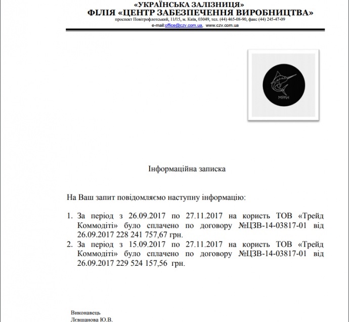 Так, протягом трьох місяців "Українська залізниця" сплатила компанії "Трейд Коммодіті" за постачання палива 457,7 мільйонів гривень, повідомляється у відповіді центру на запит проекту "Марлін".