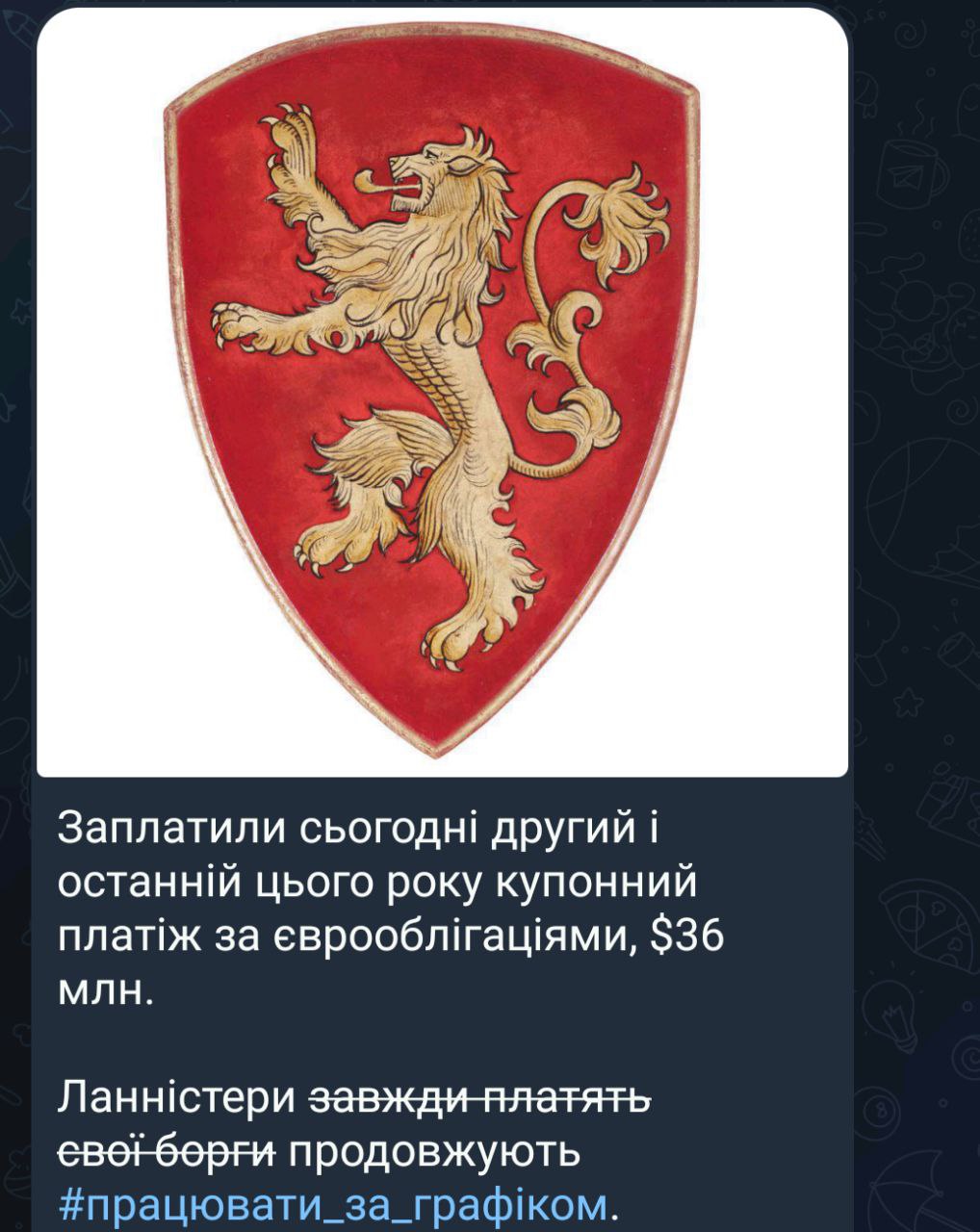 «Заплатили сьогодні другий і останній цього року купонний платіж за єврооблігаціями, $36 млн», – написав він.