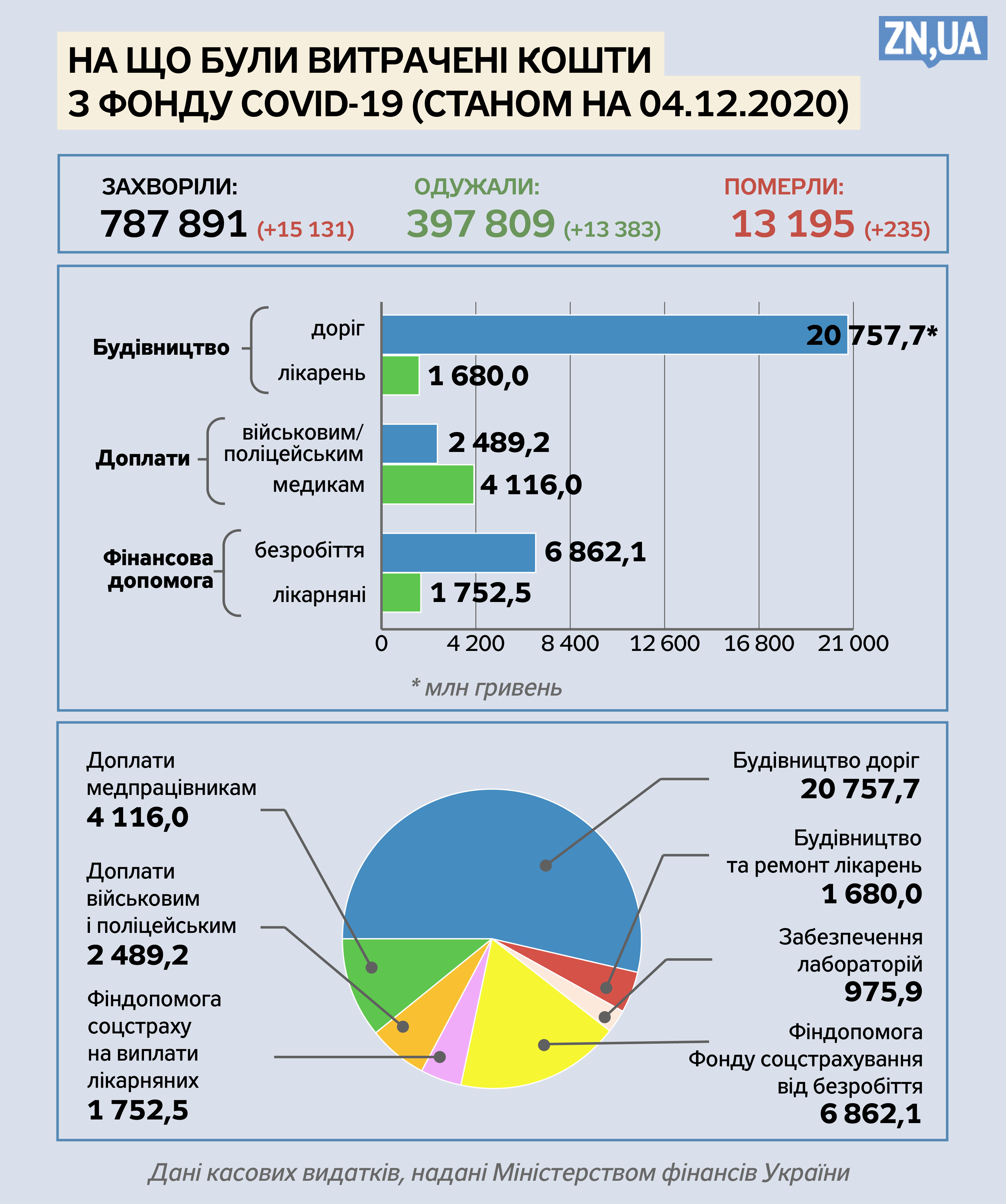 Нагадаємо, станом на ранок п’ятниці, 4 грудня, в Україні 787 891 випадок зараження коронавірусом. Протягом минулої доби діагностували 15 131 новий випадок COVID-19. Також за минулу добу госпіталізували 1 776 осіб, 235 - померли від ускладнень, 13 383 - одужали.