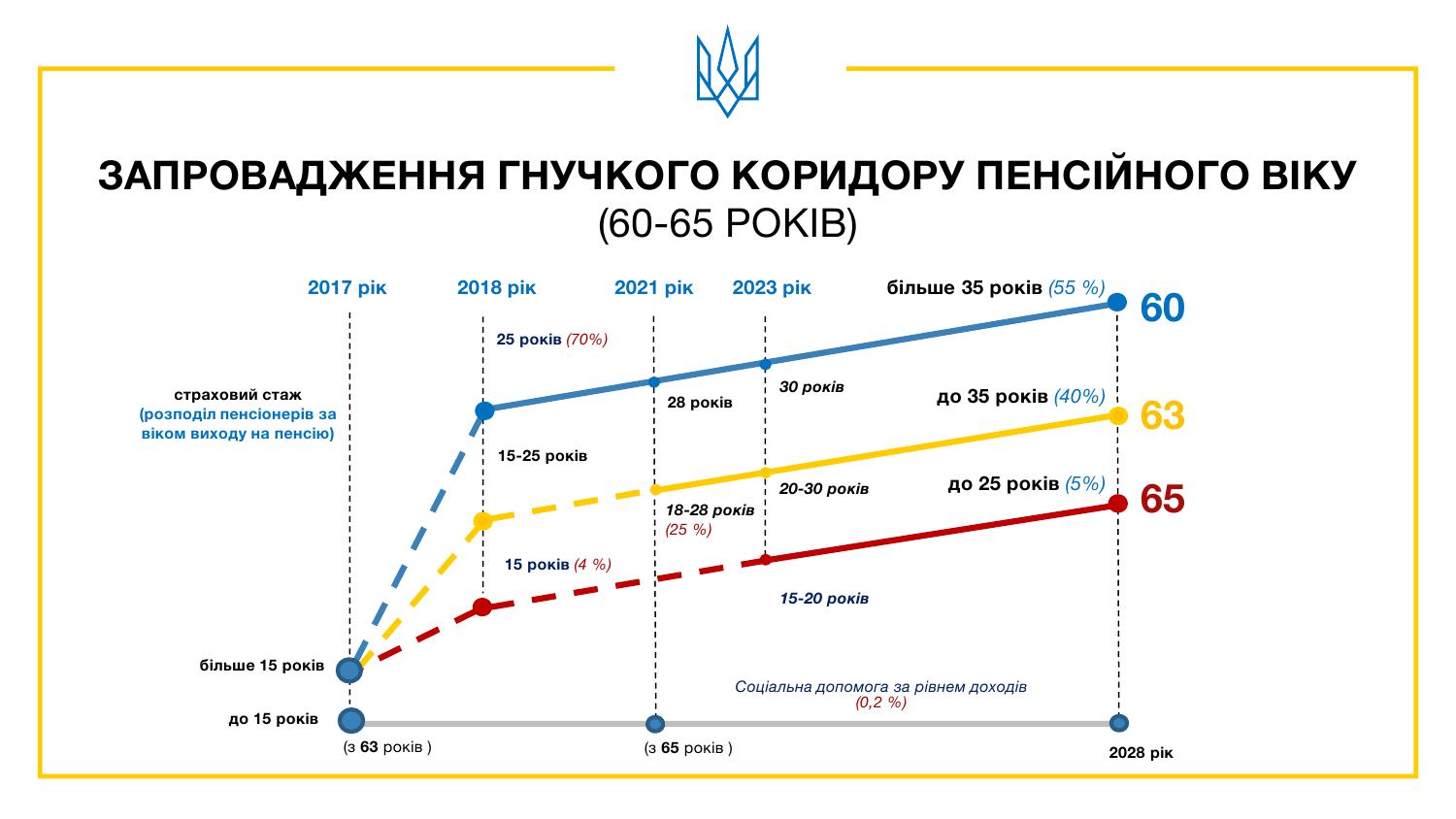 Проект пенсійної реформи, схвалений Кабінетом міністрів України, передбачає підвищення мінімального страхового стажу для отримання пенсії з 15 років до 25 років в 2018 році.