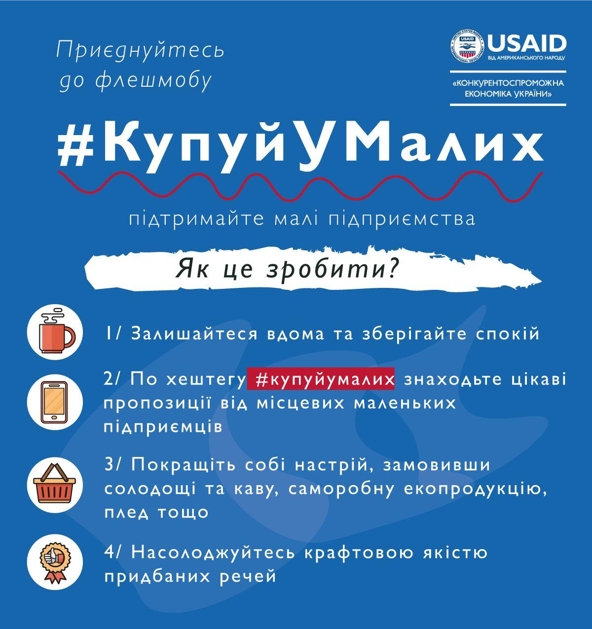 Агентство США з міжнародного розвитку USAID "Конкурентноспроможна економіка" започаткувало акцію "#КупуйУМалих", аби допомогти малому бізнесу під час запровадженого через пандемію Covid-19 карантину. Про це повідомила пресслужба агентства.
