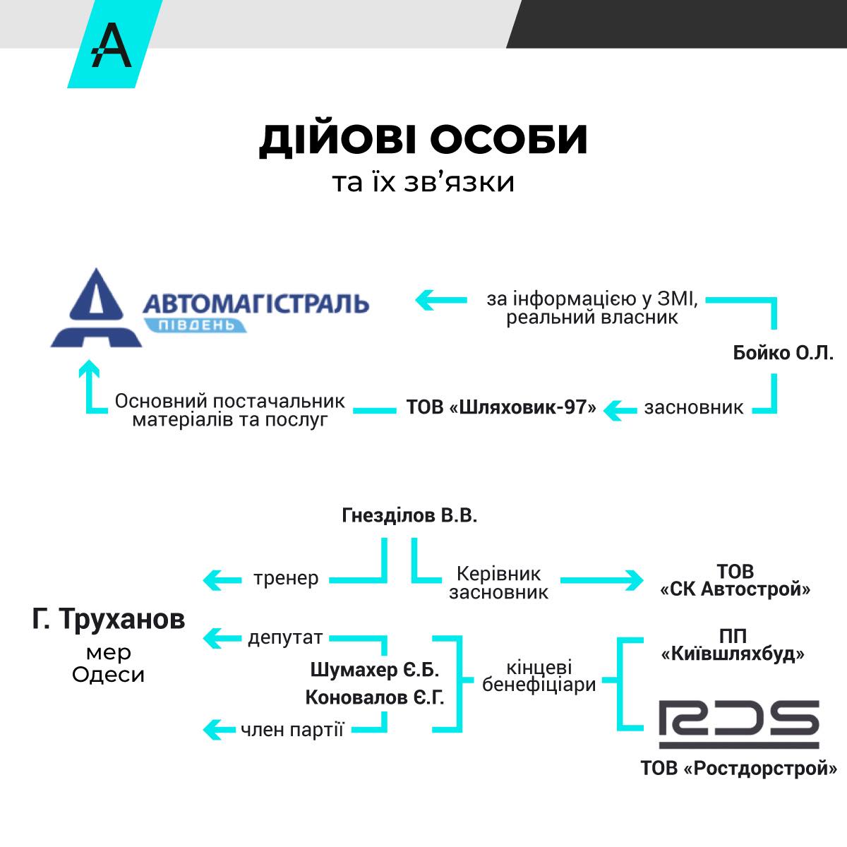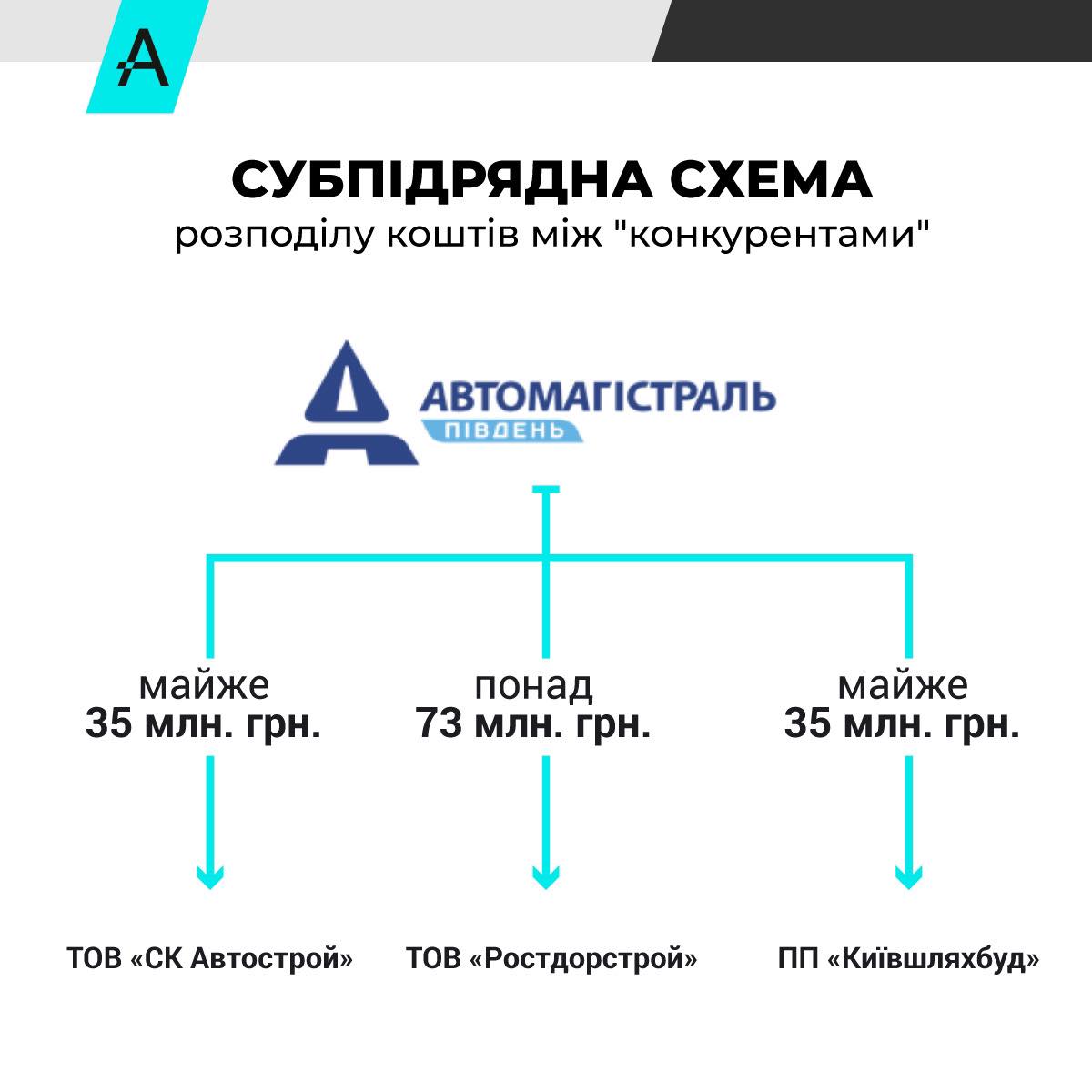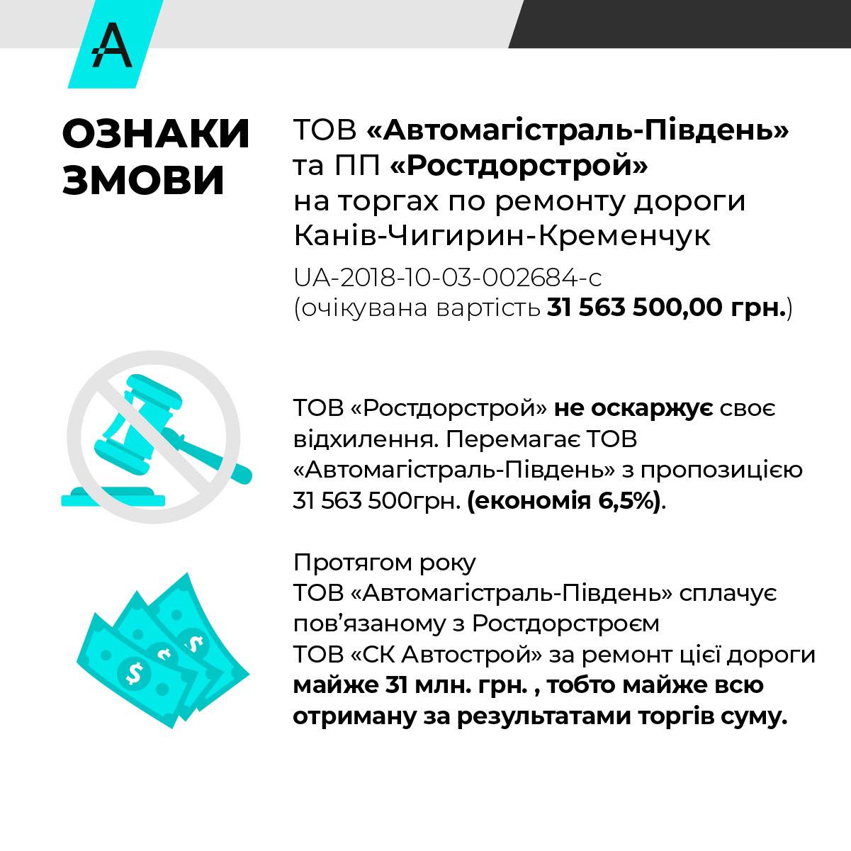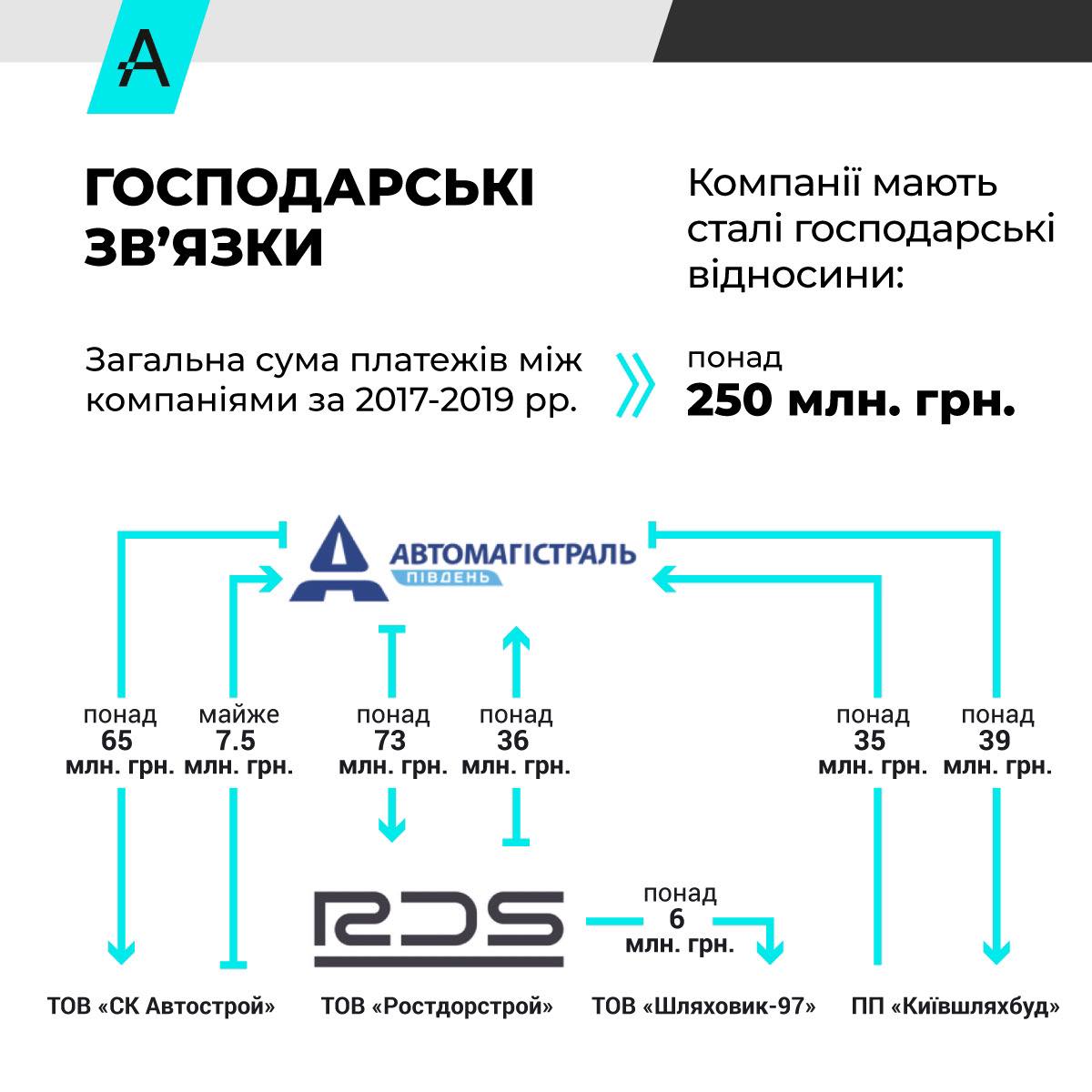 Крім цього, "конкуренти" мають сталі господарські стосунки. Наприклад, в тендері по ремонту ділянки траси Канів-Чигирин "Автомагістраль-Південь" виграла у "Ростдорстрою" аукціон вартістю 32 млн грн, а потім на виконання робіт найняла пов'язану з "Ростдорстроєм" фірму "СК Автострой" на виконання 99% робіт по цій ділянці. В тендері на реконструкцію Бортницької станції аерації ще одна пов'язана з "Ростдорстроєм" компанія "Київшляхбуд" завантажила в систему "Прозорро" свій гарантійний лист. Але в тексті листа було вказано про гарантії від імені "Автомагістралі-Південь".