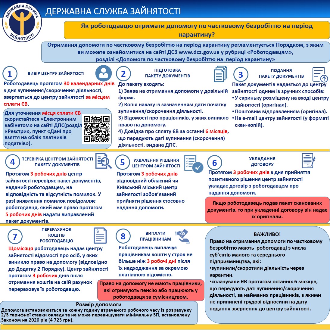 За даними ЦЗ, на отримання допомоги можуть претендувати представники малого і середнього бізнесу, які припинили або скоротили діяльність через карантин і сплачували єдиний внесок протягом 6 місяців до тимчасової зупинки діяльності і на момент звернення не скоротили персонал.