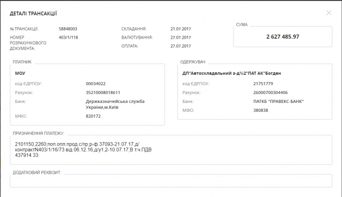Транзакція датована липнем 2017 як передоплата за поставку продукції. Які авто оплачені не зазначено.