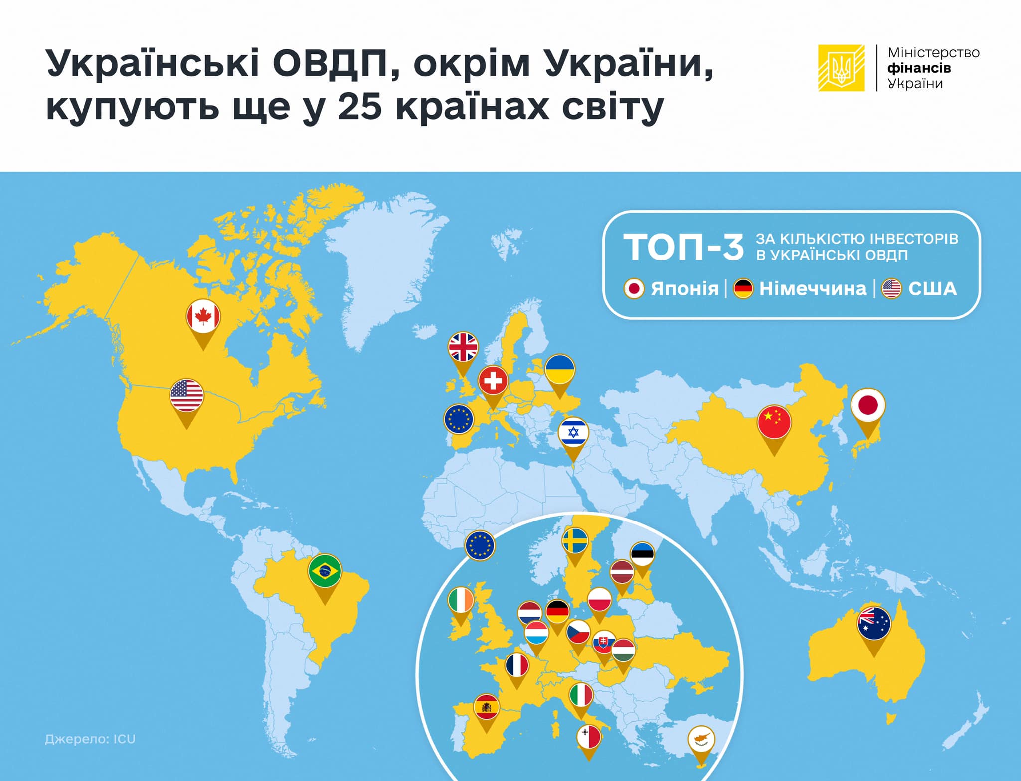 Українські державні облігації купують у 25 країнах світу, підрахували у Міністерстві фінансів України. Найбільша кількість інвесторів в нашу економіку перебувають у Японії, Німеччині та США.