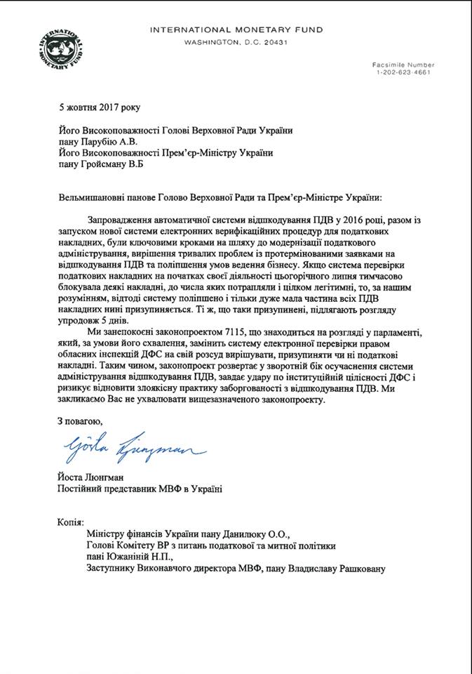 Постійний представник МВФ в Україні Йоста Люнгман звернувся листом до голови Верховної Ради України Андрія Парубія та прем'єр-міністра Володимира Гройсмана щодо законопроекту №7151 про відшкодування податку на додану вартість. Лист постійного представника МВФ на своїй сторінці в facebook опублікував народний депутат Андрій Журжій.