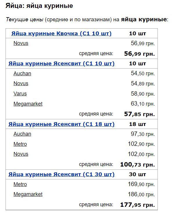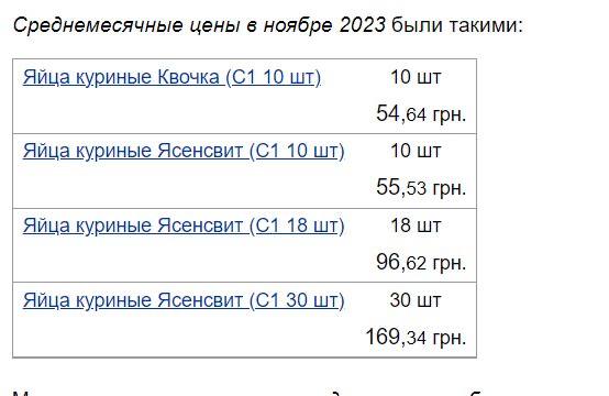 Так, у перші числа грудня порівняно із листопадом яйця подорожчали. Яйця “Квочка” додали у ціні з 54,64 грн. до 56,99 грн. за десяток, а яйця “Ясенсвіт” подорожчали із 55,53 грн. до 57,85 грн. за десяток.