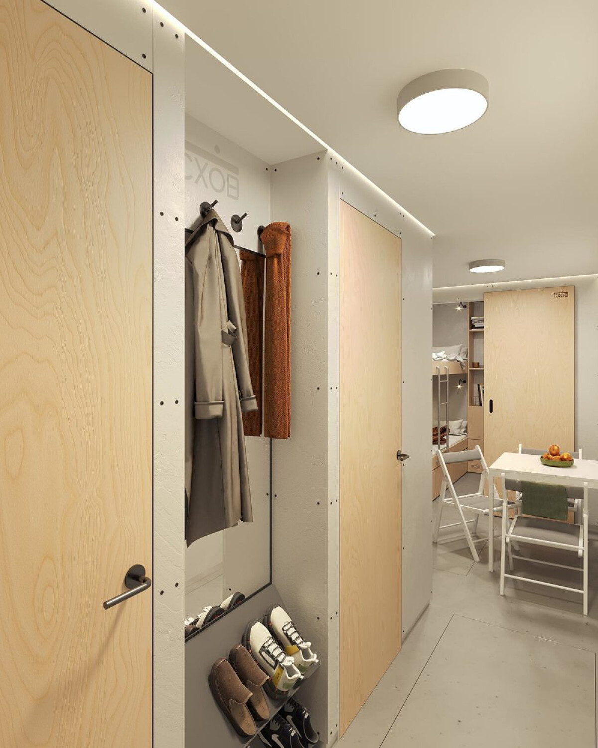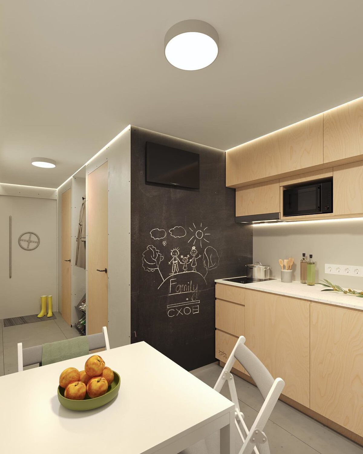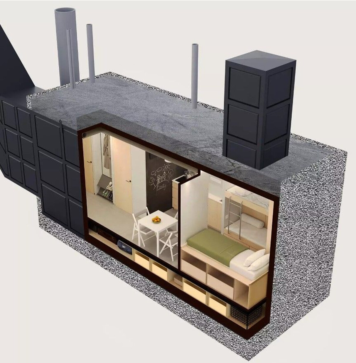 Під підлогою в будинку знаходиться спеціальний простір, який дозволяє зберігати баки з водою та бензином, продукти або речі. Завдяки цьому власник дома зможе автономно прожити без світла і води понад тиждень.