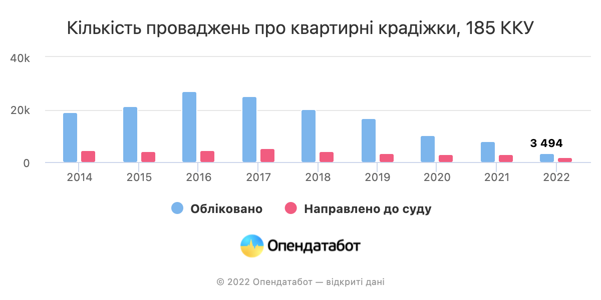 Чи не єдина стаття Кримінального Кодексу, за якою ситуація покращилась — це квартирні крадіжки. Так, кількість облікованих проваджень за статтею 185 ККУ зменшилась торік у понад 2 рази.
