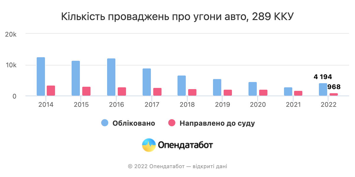 Майже вдвічі за рік зросла кількість облікованих проваджень про угони авто — з 2,8 тисячі до 4,1 тисячі справ. Варто зазначити, що цей показник стрімко виріс лише у порівнянні з "ковідним" 2021 роком. Натомість у попередніх роках кількість облікованих проваджень про угони авто була приблизно такою ж або навіть більшою.