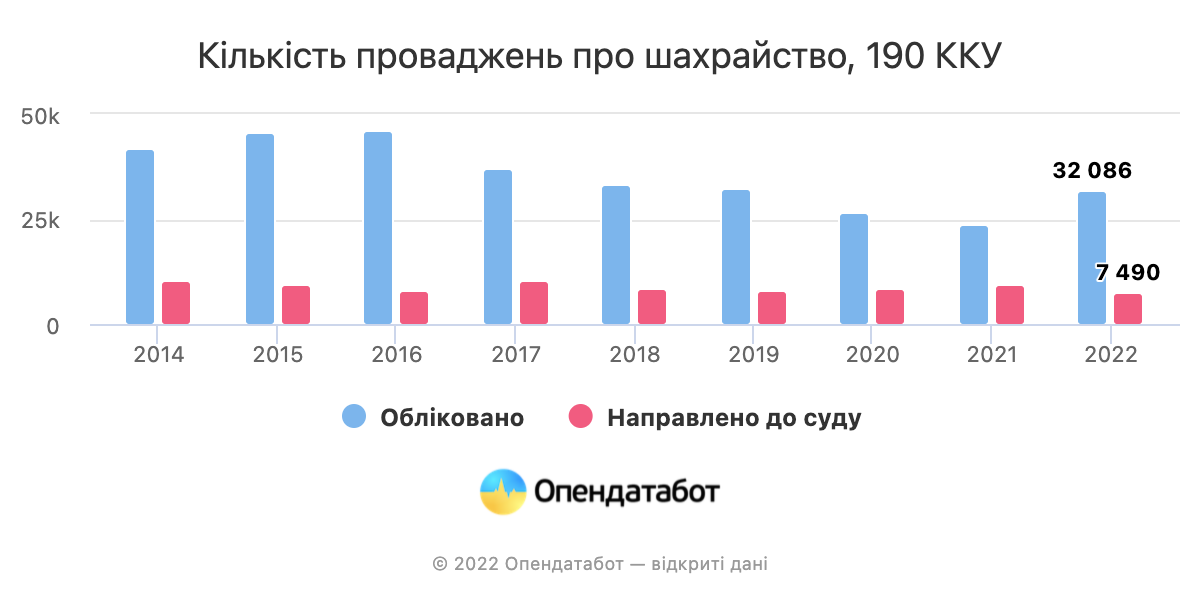 Проте у 2022 році кількість облікованих проваджень за статтею 190 ККУ зросла на 34%.