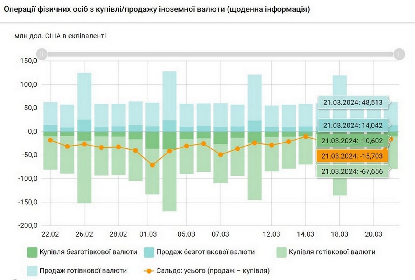 В Україні спостерігається поступове, але впевнене зростання зацікавленості до купівлі валюти фізичними особами як на безготівковому, так і на готівковому ринку. За оперативними показниками Національного банку, зростання склало у межах +500 тисяч доларів у проміжку між 19-21 березня. Разом з тим, як показує дослідження сальдо між продажем і купівлею валюти, на ринку відчувається певна стабілізація порівно з попереднім періодом і повернення до позиції у межах -15...-20 млн доларів.