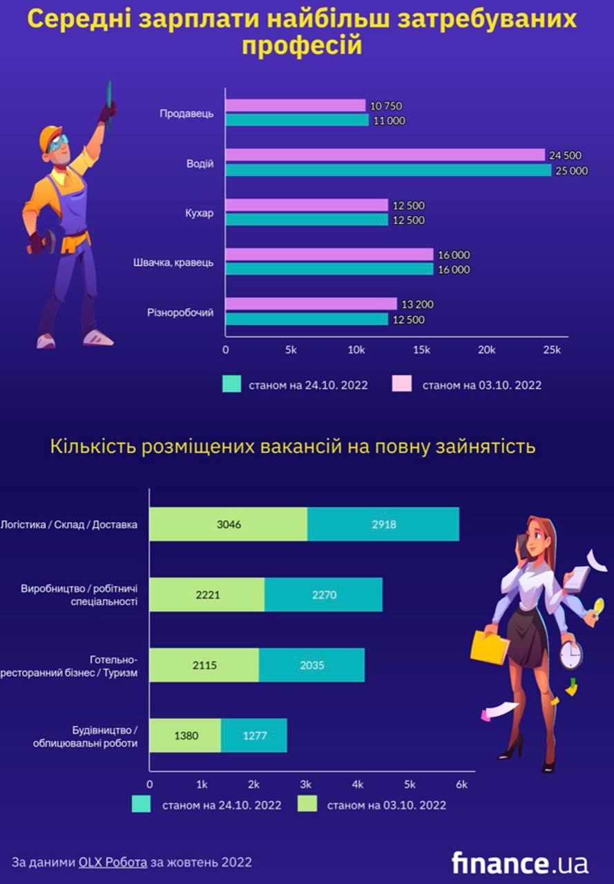 За даними сервісу OLX Робота, який спеціалізується на «блакитних комірцях», у чотирьох із п'яти сфер, де раніше найбільше шукали працівників, пропозицій роботи протягом жовтня поменшало в середньому на 5%.