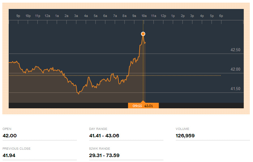 Червневі ф'ючерси на нафту марки Brent на лондонській біржі ICE Futures подорожчали на $ 0,96 (2,29%) - до $ 42,9 за барель. В ході торгів котирування піднімалися вище рівня $ 43 за барель.