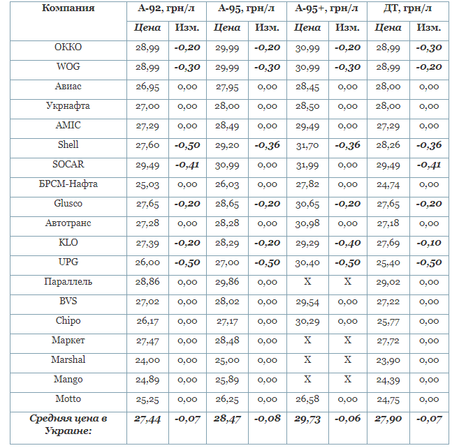 Ціни бензину А-92 та ДП на станціях ОККО і WOG зменшилися до 28,99 грн/л, А-95 - до 29,99 грн/л. У мережі Glusco паливо 12 грудня подешевшало на 20 коп/л, на станціях KLO - на 10-20 коп./л, Shell - на 40-50 коп./л. UPG опустила ціни на всі види палива на 50 коп./л.