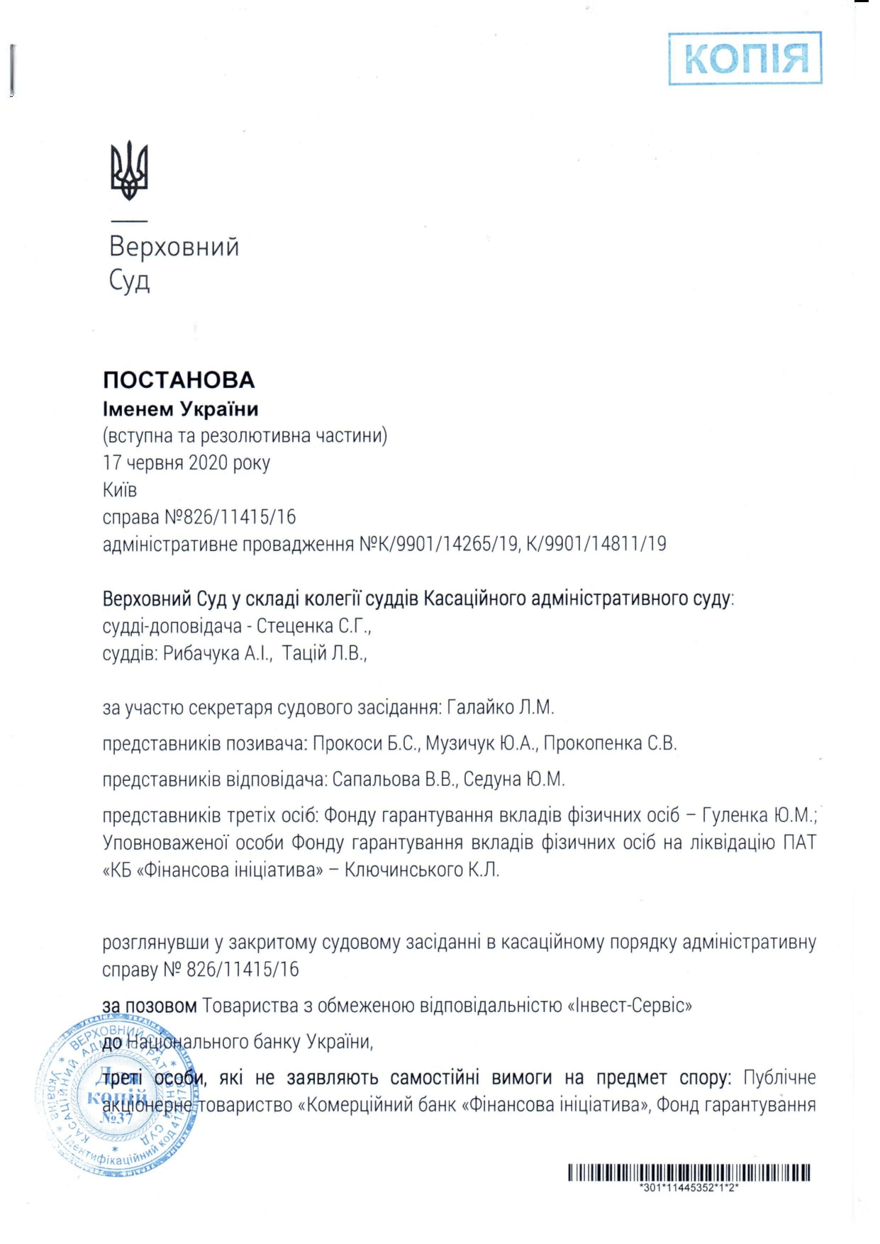 Згідно з документом, ВСУ відхилив касаційні скарги Нацбанку та Фонду гарантування вкладів фізичних осіб на рішення судів першої та другої інстанцій.