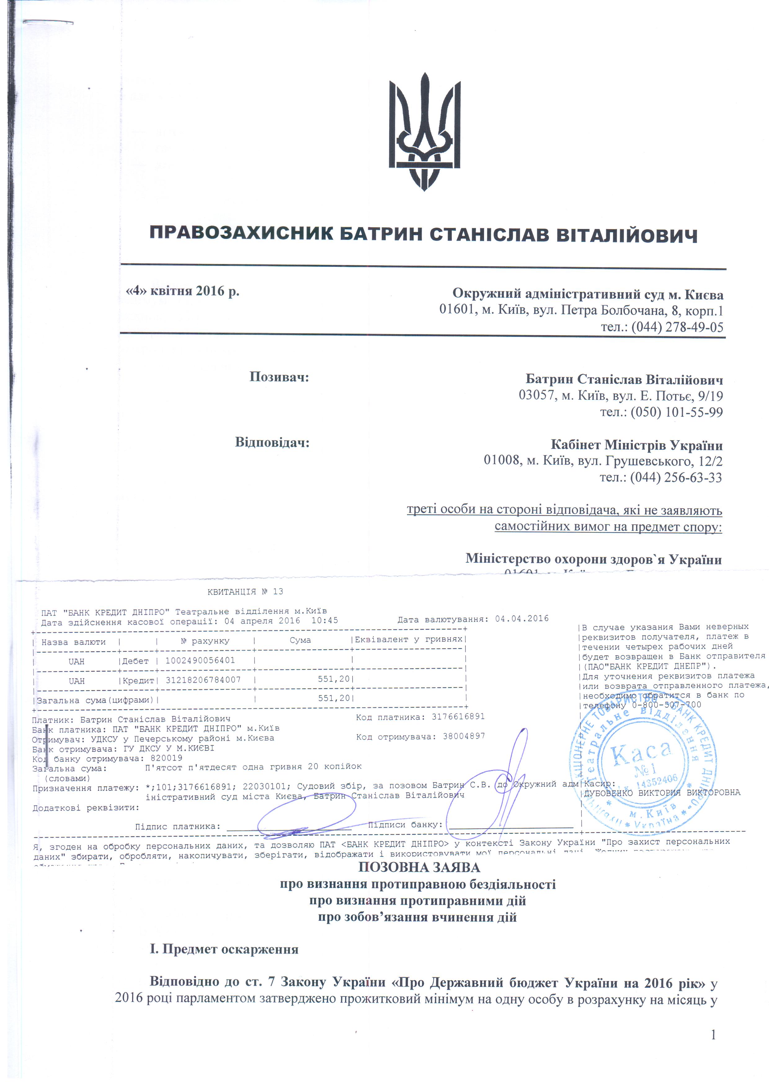 Так, сьогодні у понеділок, 4 квітня, правозахисник Станіслав Батрин подав черговий позов проти уряду України з вимогою визнати протиправними дії Кабміну з встановлення розміру прожиткового мінімуму на 2016 рік всупереч вимогам закону та без попереднього затвердження висновків науково – громадської експертизи "споживчого кошику".