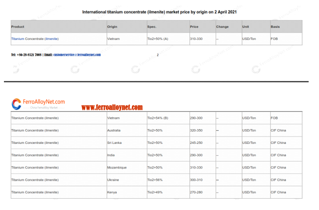 Аналітики ferroalloynet.com подавали інформацію про те, що вартість ільменіту такого змісту на умовах CIF, Китай 2 квітня становила $337-348 за тонну. Це означає, що за вирахуванням фрахтових послуг в Україні, ільменіт мав реалізуватися за ціною не менше $267-284 за т.
