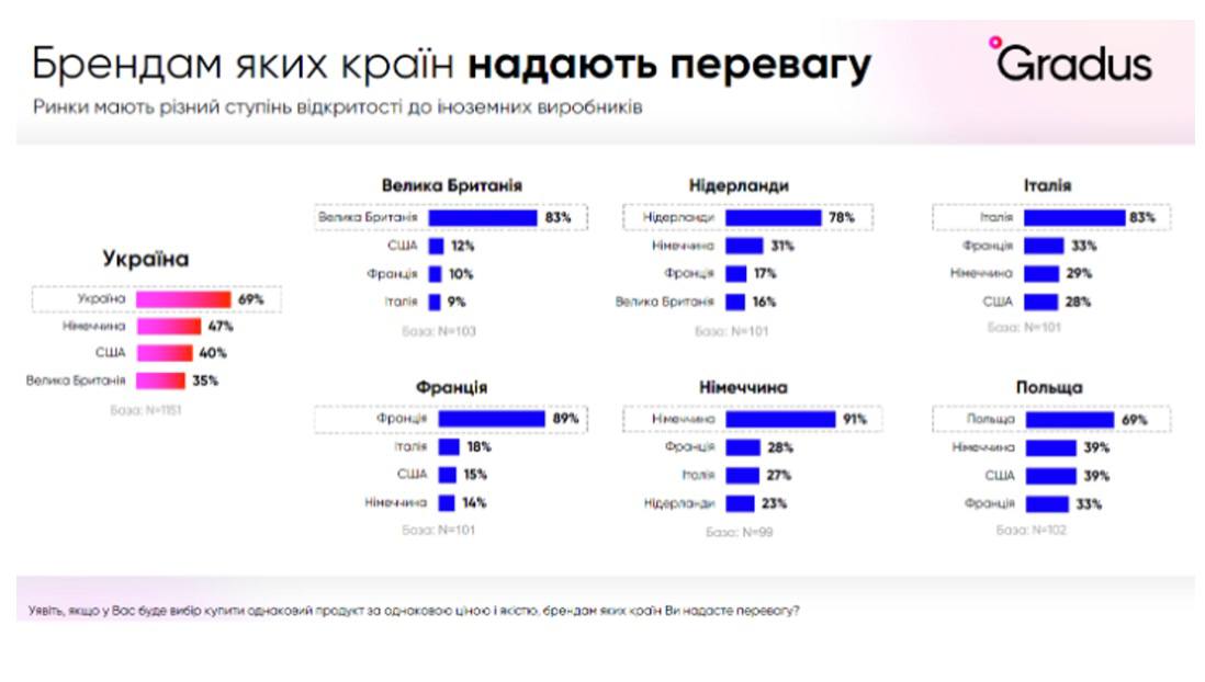 - Нідерланди та Німеччина потрапили до розряду помірних країн, там велика лояльність до місцевих виробників, проте вони розглядають купівлю брендів з інших країн на високому рівні;