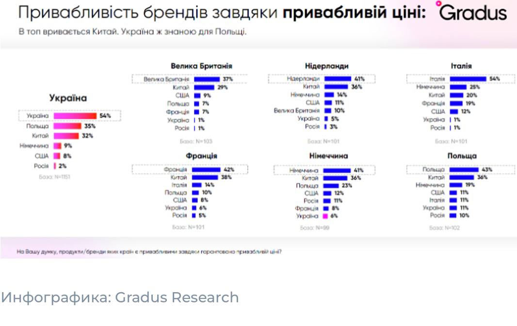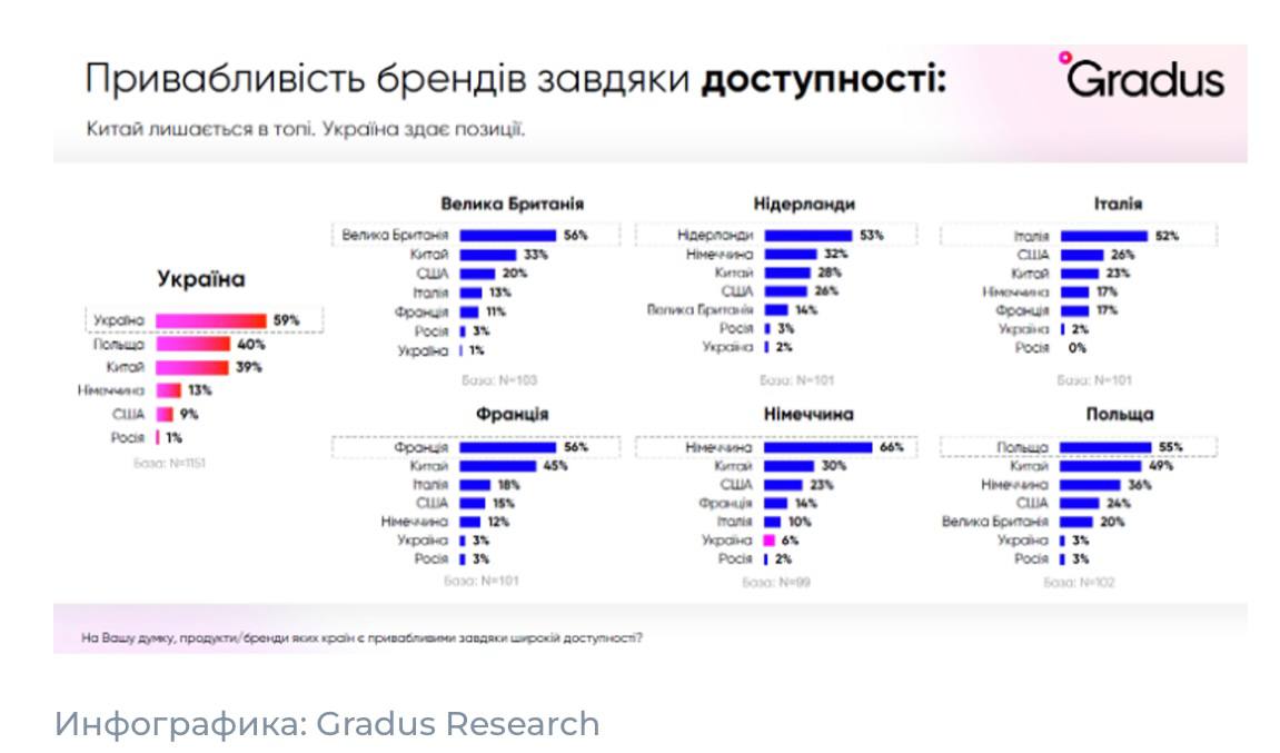 Привабливість брендів з боку доступності, дистрибуції – важливий чинник. В Україні Польща та Китай максимально високі та близькі категорії. Натомість, дистрибуція по інших країнах залежить від конкретних компаній, окремих мереж, які побудовані. Для Великобританії це Китай та США, для Нідерландів – Німеччина та Китай, для Італії – США та Китай. Спостерігається велика присутність Китаю за рахунок онлайн-торгівлі та інших каналів збуту, заповнених китайськими товарами.
