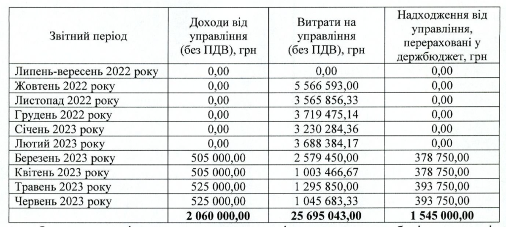 Так, доходи від управління заарештованим майном почали надходити лише в березні 2023 року і до червня загалом склали суму 2,06 млн грн. При цьому надходження від управління АЗС до бюджету за березень-червень 2023 року склали 1,54 млн грн.