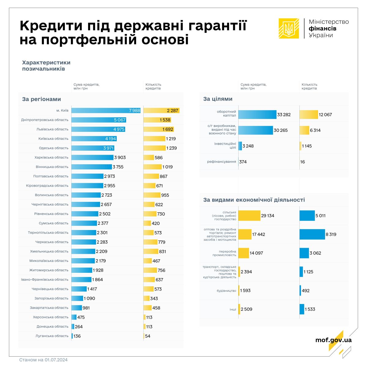 Як повідомлялося раніше, у червні 2024 року укладено 767 кредитних договорів підтримки мікро, малого та середнього бізнесу на 2,4 млрд грн. У цих кредитах частка зобов’язань за основним боргом, гарантованих державою, складає 1,3 млрд гривень.