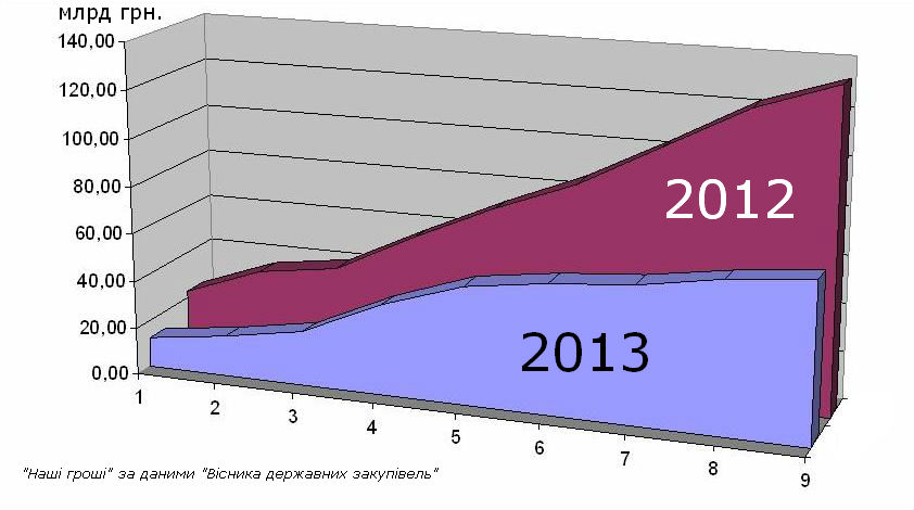 У січні-лютому 2013 року у "Віснику державних закупівель" були опубліковані дані про тендери на загальну суму 66,41 млрд грн. Це вдвічі менше, ніж за цей же період 2012 року, - тоді були опубліковані дані про тендери на суму 133,26 млрд грн, йдеться в дослідженні "Наших грошей".