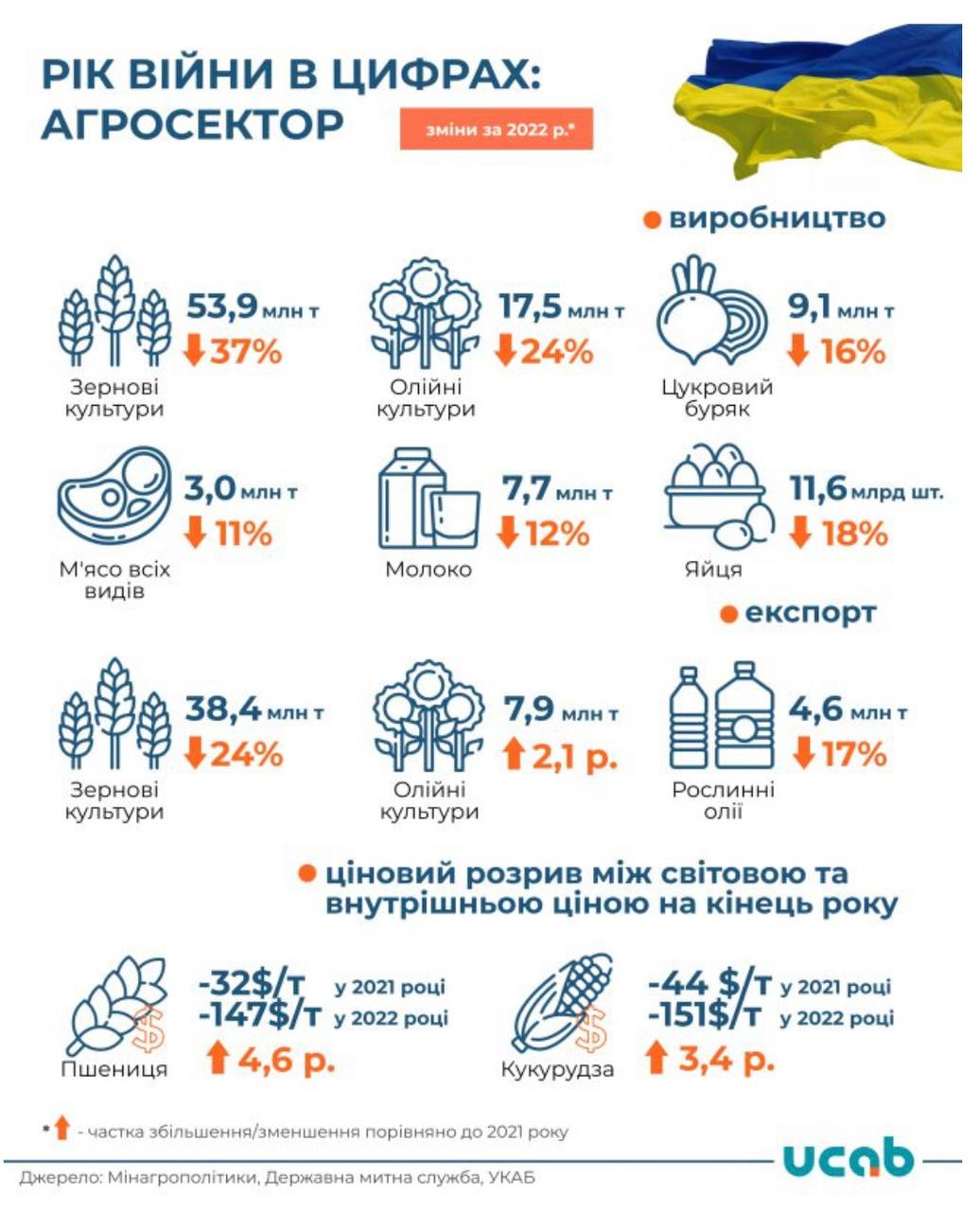 Крім того, виробництво всіх видів м’яса торік скоротилося на 11% порівняно з 2021 р. і було на рівні 3 млн т, молока — 7,7 млн т (-12%) та яєць — 11,6 млрд шт. (-18%).