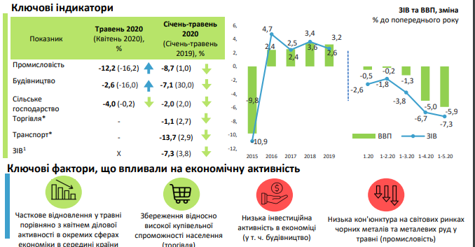 Зокрема, за підсумками січня-травня 2020 року скорочення зведеного індексу виробництва товарів і послуг склало 7,1%. У січні-квітні падіння даного показника було зафіксовано на рівні 6,7%, говориться в огляді міністерства.