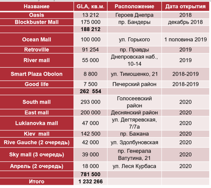 При цьому до кінця 2018 року або на початку 2019 року відкриють чотири ТРЦ: Oasis на Героїв Дніпра, Blockbuster Mall на Бандери, Smart Plaza Obolon і Good Life.
