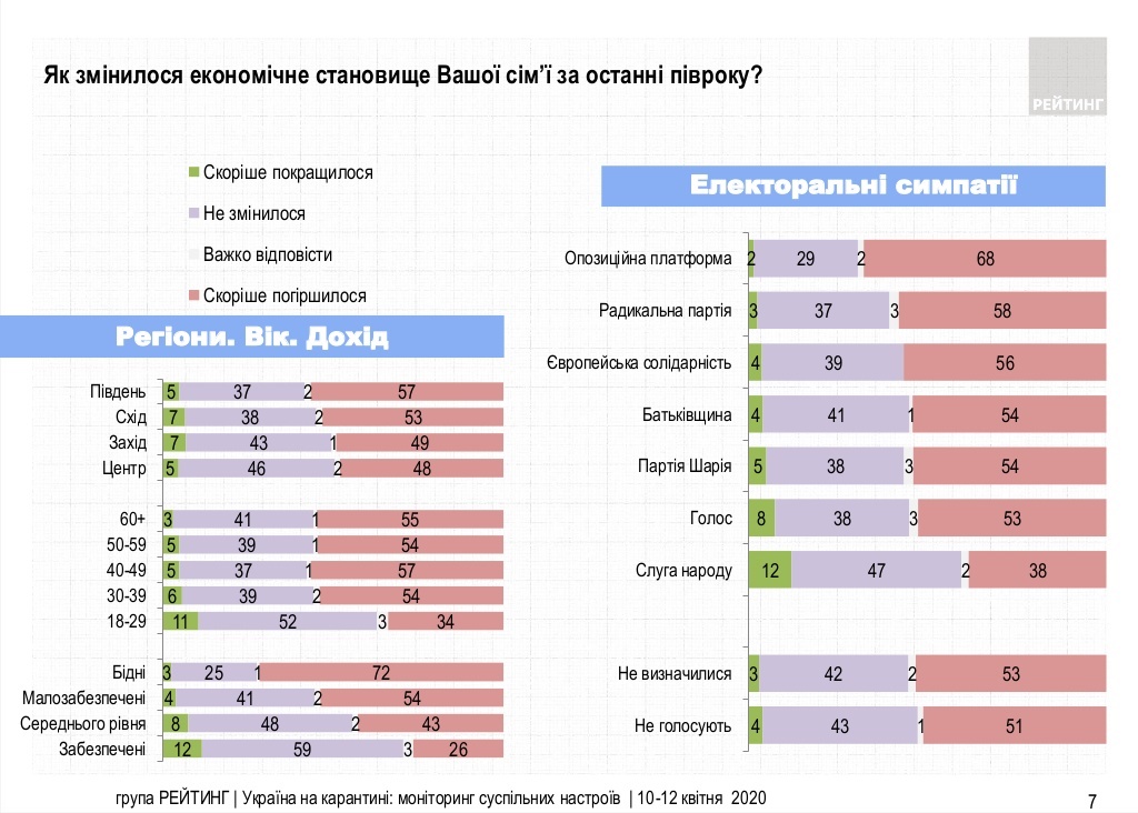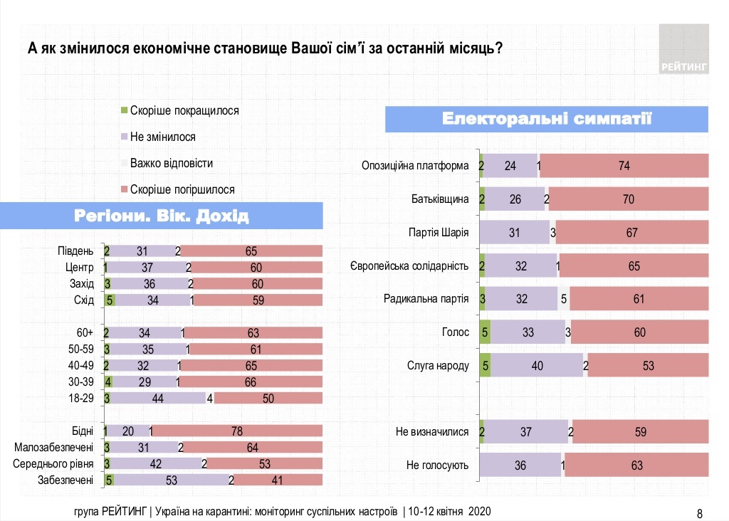 Варто також зазначити, що 61% респондентів, які повідомили про економічне погіршення, стверджують, що особливе загострення було відчутно впродовж останнього місяця. З них також 35% сказали, що не відчули змін, і лише 3% говорили про поліпшення. Найбільш песимістичні настрої спостерігаються у людей похилого віку та у бідних.
