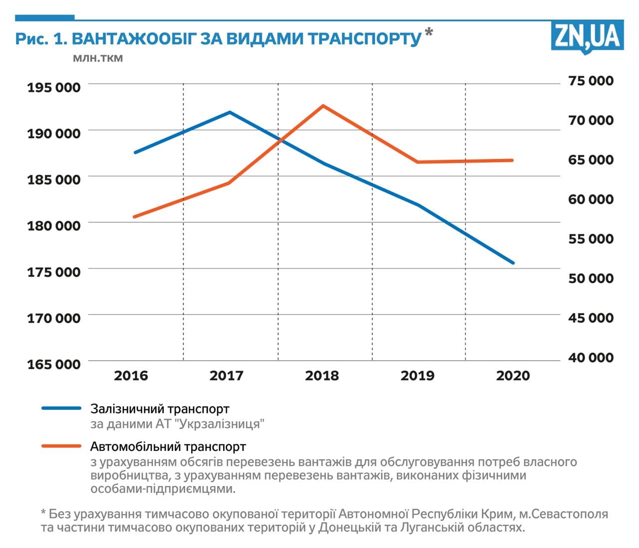 2020 року, за даними Держстату, тільки 27% загального вантажообігу припадало на автомобільний транспорт, а 72% — на залізницю. На водний та авіаційний транспорт припадає лише 1% транспортної роботи. Це дані без урахування трубопровідної інфраструктури, яка є специфічною і майже не конкурує з іншими видами транспорту.