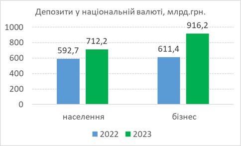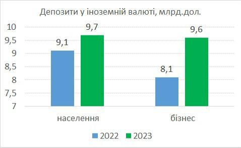 Зокрема, вклади у національній валюті зросли на 35% (+424 млрд. грн.) до 1628 млрд. грн. Вклади в іноземній валюті зросли на 12% (+2 млрд. дол.) до 19,2 млрд. дол.