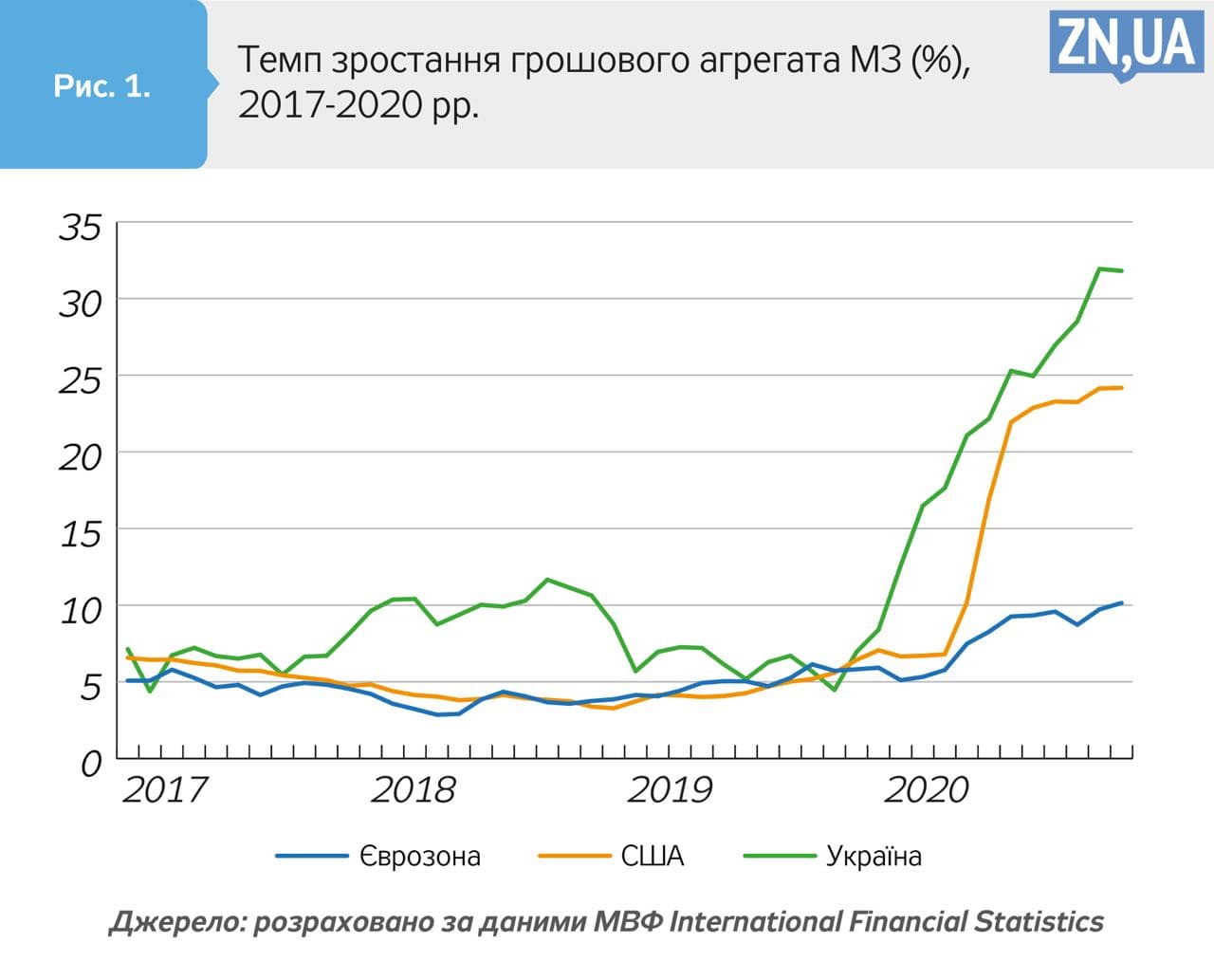 Національний банк України за динамікою збільшення грошової маси не лише далеко попереду американської Федеральної резервної системи, а й розпочав монетарне пом’якшення майже на пів року раніше — ще до початку пандемії COVID-19. Грошова маса в Україні зросла на 28% (рис.1), що за умов скорочення обсягів виробництва товарів і послуг, що об’єктивно знижує попит на гроші, — це аж ніяк не ознака грошового голоду.