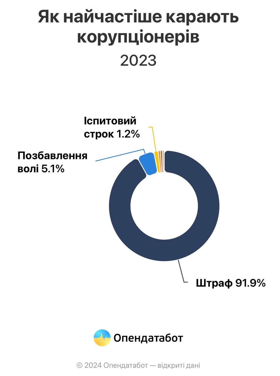 Найчастіше зловмисників засуджують до штрафів – 92% вироків. Позбавлення волі та громадські роботи або ж іспитовий строк сумарно становлять десь 5-8% покарань.