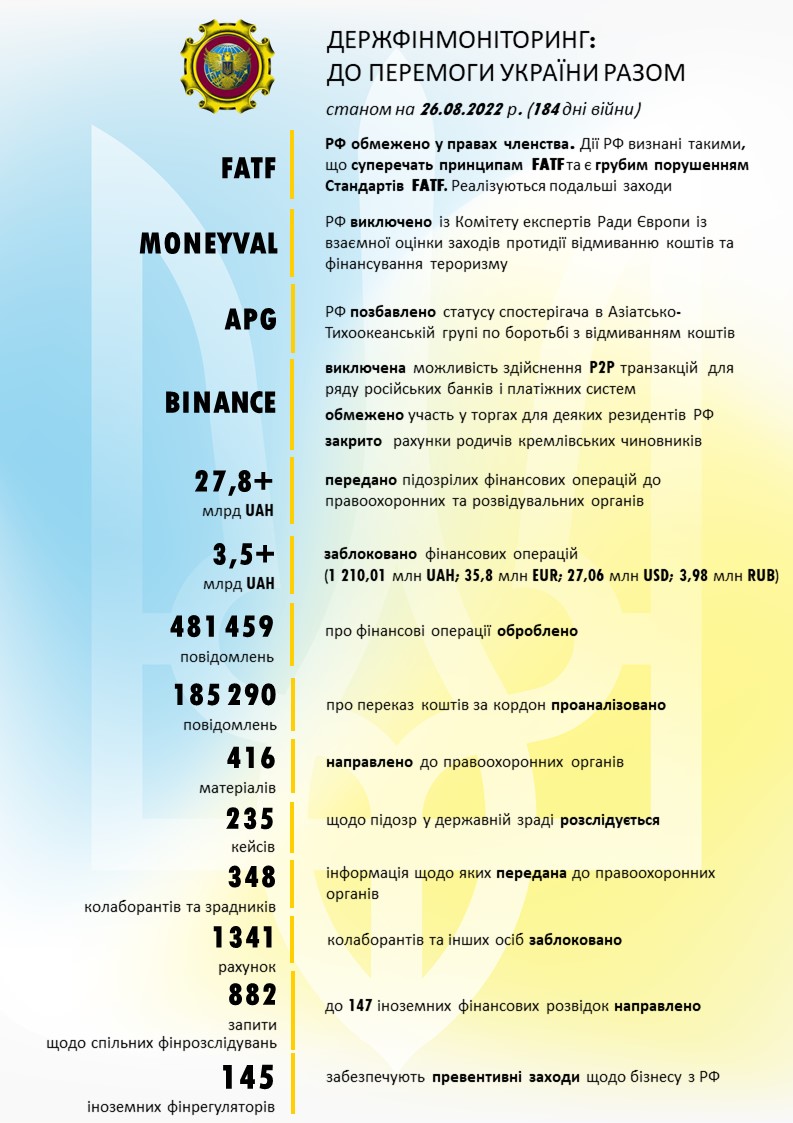 Державна служба фінансового моніторингу України опублікувала звіт про результати боротьби проти РФ на фінансовому фронті станом на 184 день повномасштабної війни.