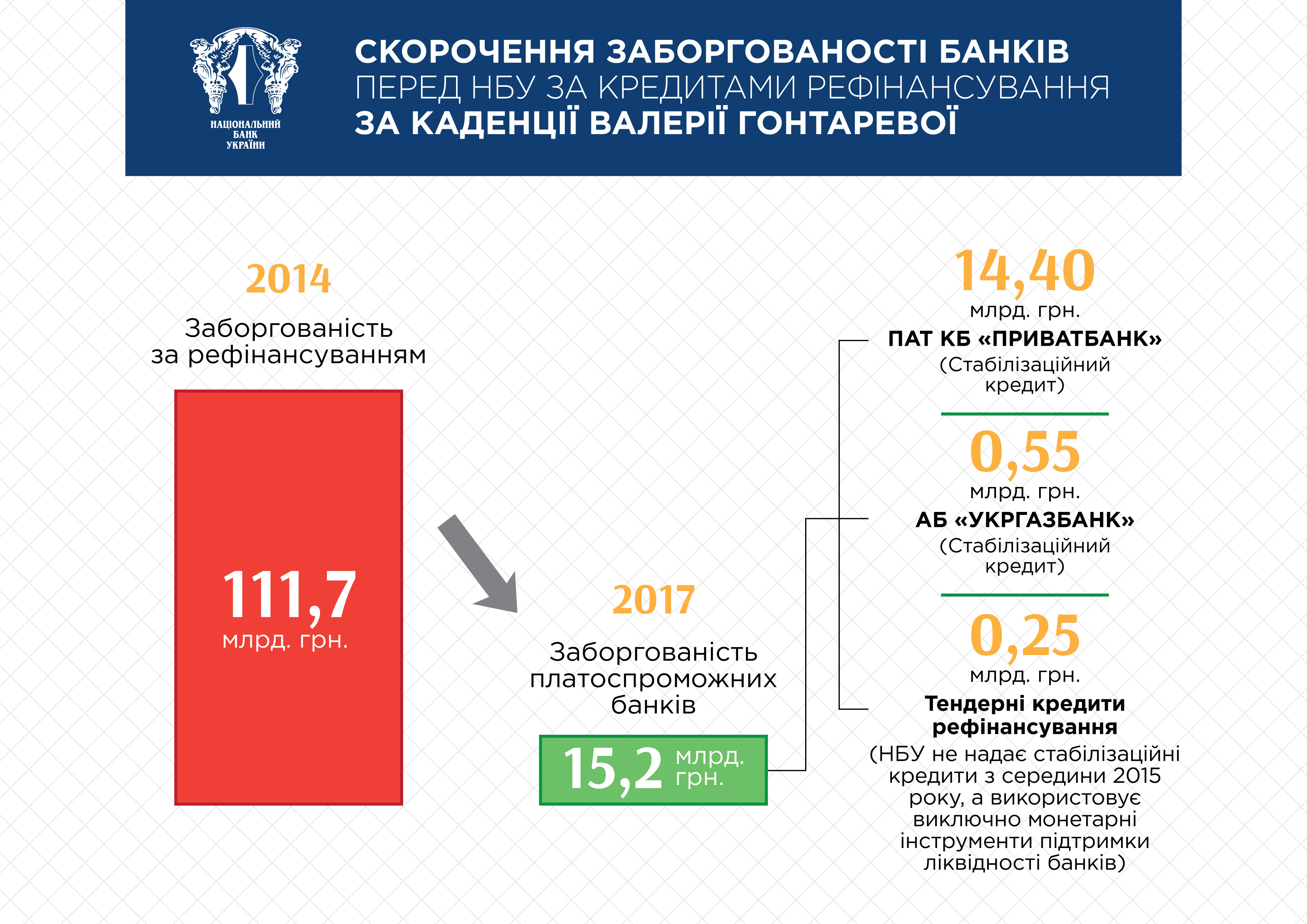 В НБУ нагадали, що в червні 2014 року заборгованість банків за рефінансуванням становила 111,7 млрд грн, а на 5 квітня 2017 року цей показник в0 платоспроможних банках становить 15,2 млрд грн, 14,4 млрд грн з яких припадає на ПАТ "ПриватБанк".