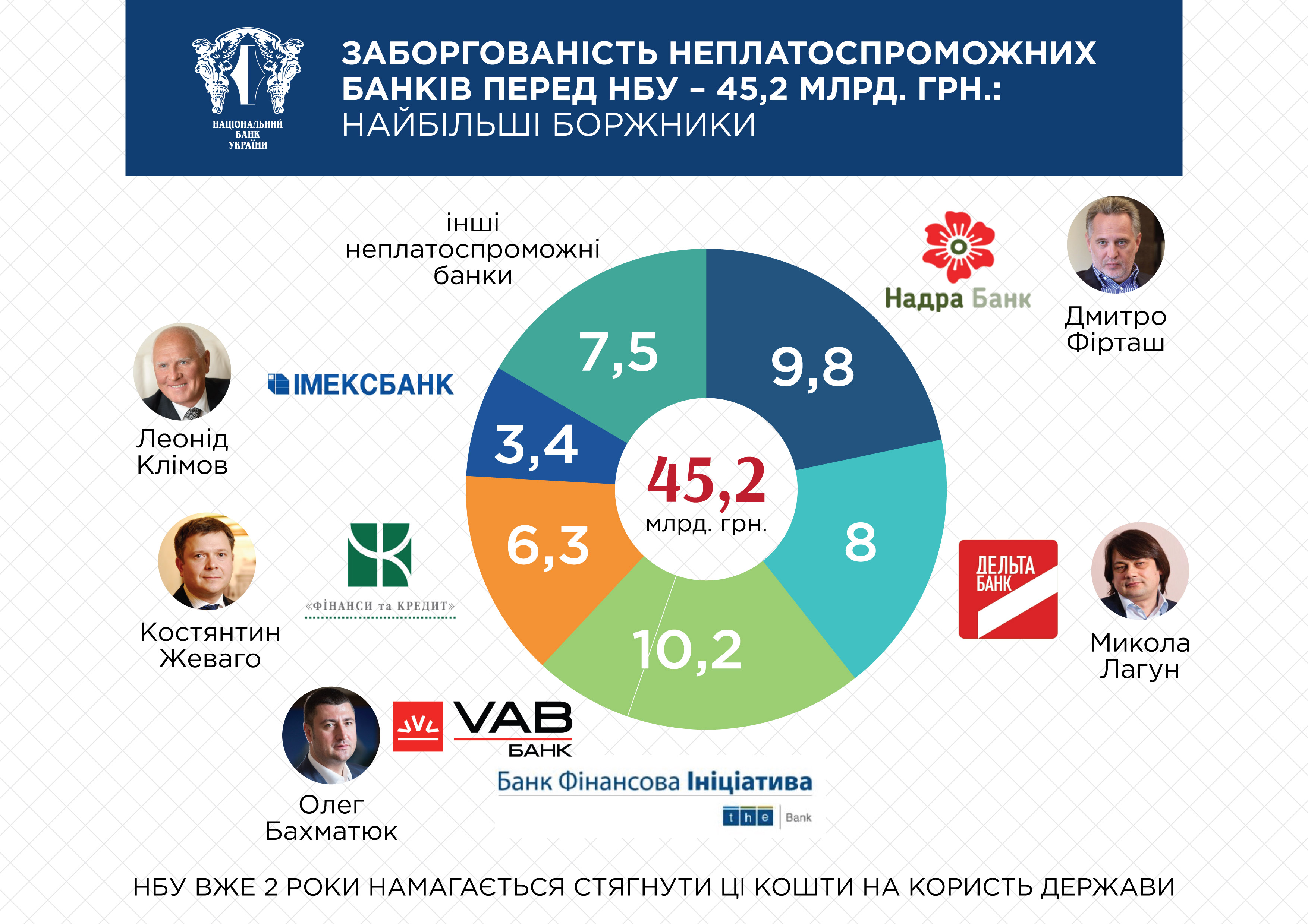 Серед неплатоспроможних банків нині найбільшими боржниками за виданим рефінансування є банки "Надра" (9,8 млрд грн, власник - Дмитро Фірташ), "Дельта" (8 млрд грн, власник - Микола Лагун), "Фінансова ініціатива" (7,2 млрд грн) і "ВАБанк" (3 млрд грн, власник банків - Олег Бахматюк), "Фінанси і кредит" (6,3 млрд грн, власник - Костянтин Жеваго), "Імексбанк" (3,4 млрд грн, власник - Леонід Клімов).