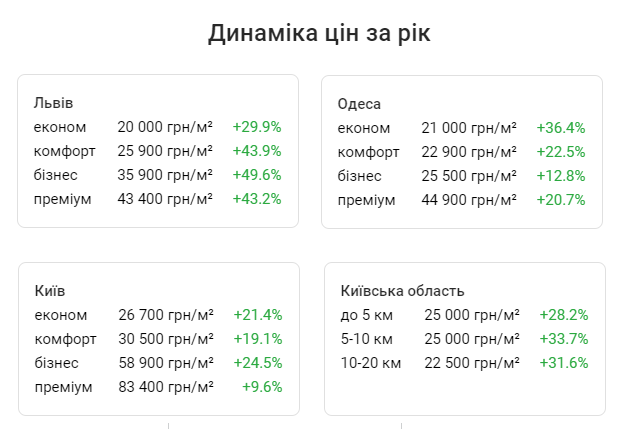 Ціни у цих регіонах у червні на квадратні метри в новобудовах також зросли у порівнянні з лютневими, у повній відповідності з темпами відновлення будівництва. Найбільше - у Львові, на другому місці Одеська область, на третьому - Київ та Київська область.