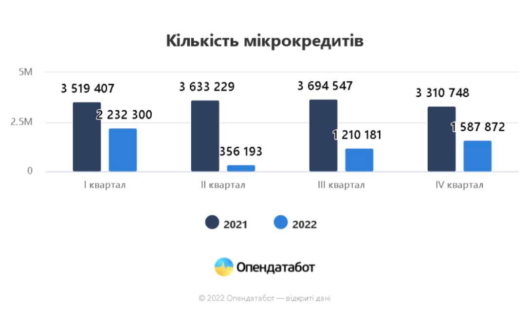 Загалом торік було укладено 5,3 млн кредитних договорів. В середньому, за місяць українці брали майже півмільйони мікропозик. Хоча у 2021 в середньому укладалося 1,1 млн договорів на місяць.