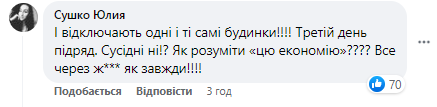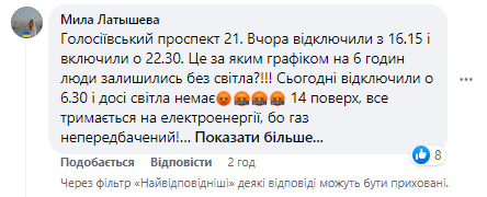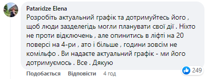 Водночас у коментарях до повідомлення, в якому оприлюднено графіки, споживачі масово скаржаться на те, що дані графіки не дотримуються, споживачів відключають поза чергами, а саме відключення триває більше заявлених 4 годин.